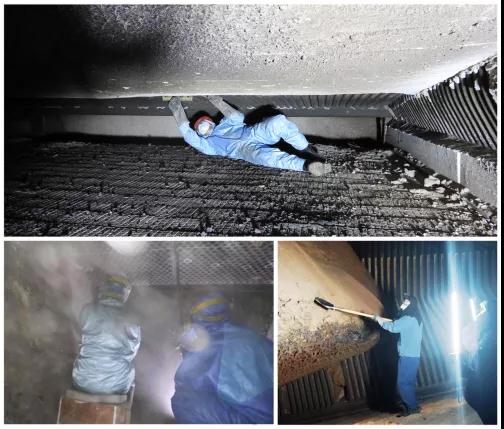 夏季,管網(wǎng)檢修,爐膛清理,設(shè)備改造等各類事項(xiàng)排滿了整個(gè)檢修期。爐膛的火雖然熄滅了,但是熱力人卻依然在忙碌著。鍋爐的清灰工作看似簡(jiǎn)單,但事實(shí)上鍋爐內(nèi)的作業(yè)空間十分狹小,無(wú)法起身,漆黑的爐膛里,灰塵彌漫,長(zhǎng)熱集團(tuán)汽開(kāi)事業(yè)部的司爐工揮汗如雨,輪番作業(yè),灰塵從他們的衣袖、領(lǐng)口、面罩、帽檐處鉆入,黏在身上,粘在頭發(fā)上,透過(guò)面罩鉆入鼻腔、呼吸道,時(shí)間一久,就會(huì)胸悶心悸,甚至連氣都喘不上來(lái)。鉆煙囪、進(jìn)爐膛、清灰、疏通管道,這一系列動(dòng)作辛苦異常,就像這樣干上一會(huì)兒就會(huì)讓人覺(jué)得難受的工作,已成為熱力人每年非運(yùn)行期的必修課,沒(méi)錯(cuò)這就是默默付出的熱力人。